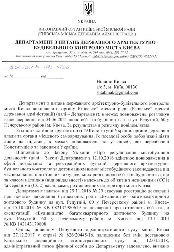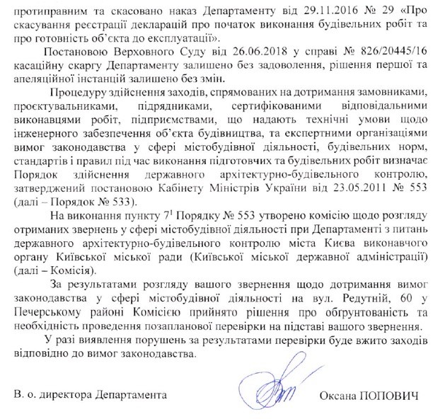 Согласно содержанию письма, исполняющая обязанности директора Департамента Оксана Попович гарантирует, что скандальную застройку проверят на счет соблюдения владельцем дома государственных строительных норм, градостроительных условий и ограничений, норм пожарной безопасности, а также требования генплана города Киева в целом.