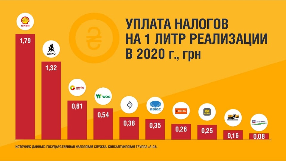 "Эта сеть ("БРСМ-нафта") обладает наивысшим на рынке показателем суточной реализации через одну АЗС, но, как видим, эффективность такого успеха для государства весьма сомнительна. Она составляет около 16 коп./л, тогда как менее "успешные" лидеры рейтинга ОККО и Shell отчисляли в госказну 1,32 и 1,79 грн/л соответственно. Но абсолютным "чемпионом" стала сеть "Авантаж 7". По ней налоговая нагрузка на литр составила около 8 копеек или была фактически нулевой", - пишется в статье.
