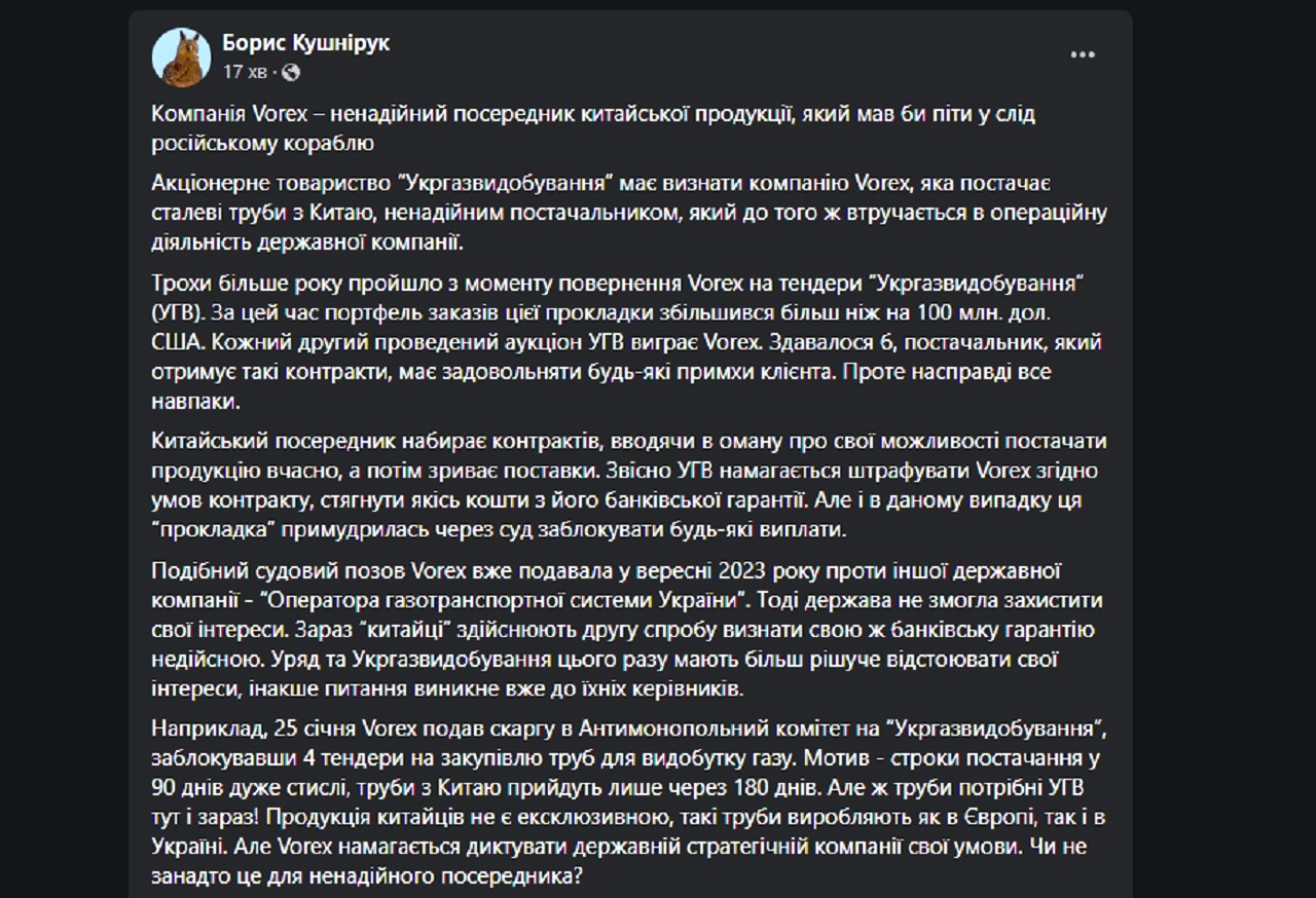 "25 января Vorex подал жалобу в Антимонопольный комитет на "Укргазвыдобування", заблокировав 4 тендера на закупку труб для добычи газа. Мотив - сроки поставки в 90 дней очень сжатые, трубы из Китая придут только через 180 дней. Но ведь трубы нужны УГВ здесь и сейчас!.. Такие трубы производят как в Европе, так и в Украине. Но Vorex пытается диктовать государственной стратегической компании свои условия", – отметил он.
