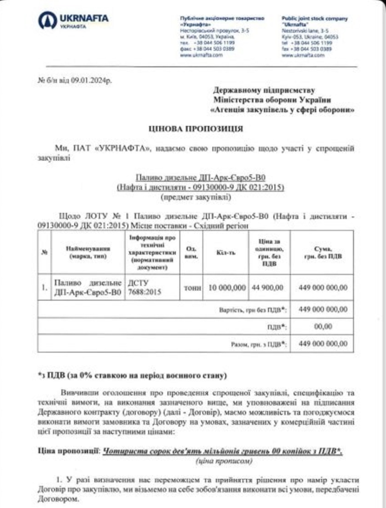 22 декабря Минобороны объявило новый тендер на закупку горючего на 3,4 млрд грн по нулевой ставке НДС, и уже 9 января 2024 "Укрнафта" предложила его реализацию Минобороны также с нулевой ставкой.