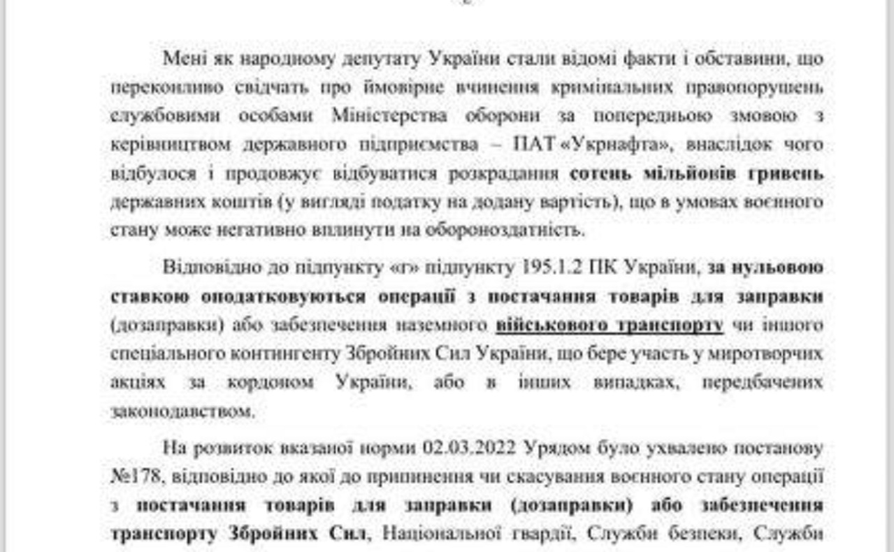 Он пояснил, что решением Кабмина с 24 февраля 2022 все операции по поставке нефтепродуктов для обеспечения силовых ведомств облагаются налогом на добавленную стоимость по нулевой ставке, и еще в марте и мае 2023 "Укрнафта" поставляла Нацгвардии топливо на почти пол миллиарда гривен. Однако в январе и мае 2023 "Укрнафта" заключила аналогичные контракты по поставке топлива для Минобороны со ставкой НДС 7%. Так, МО закупило дизтоплива и бензинов на 5,5 млрд грн, уплатив дополнительно 350 млн грн налога на добавленную стоимость, который по закону платить не должно.