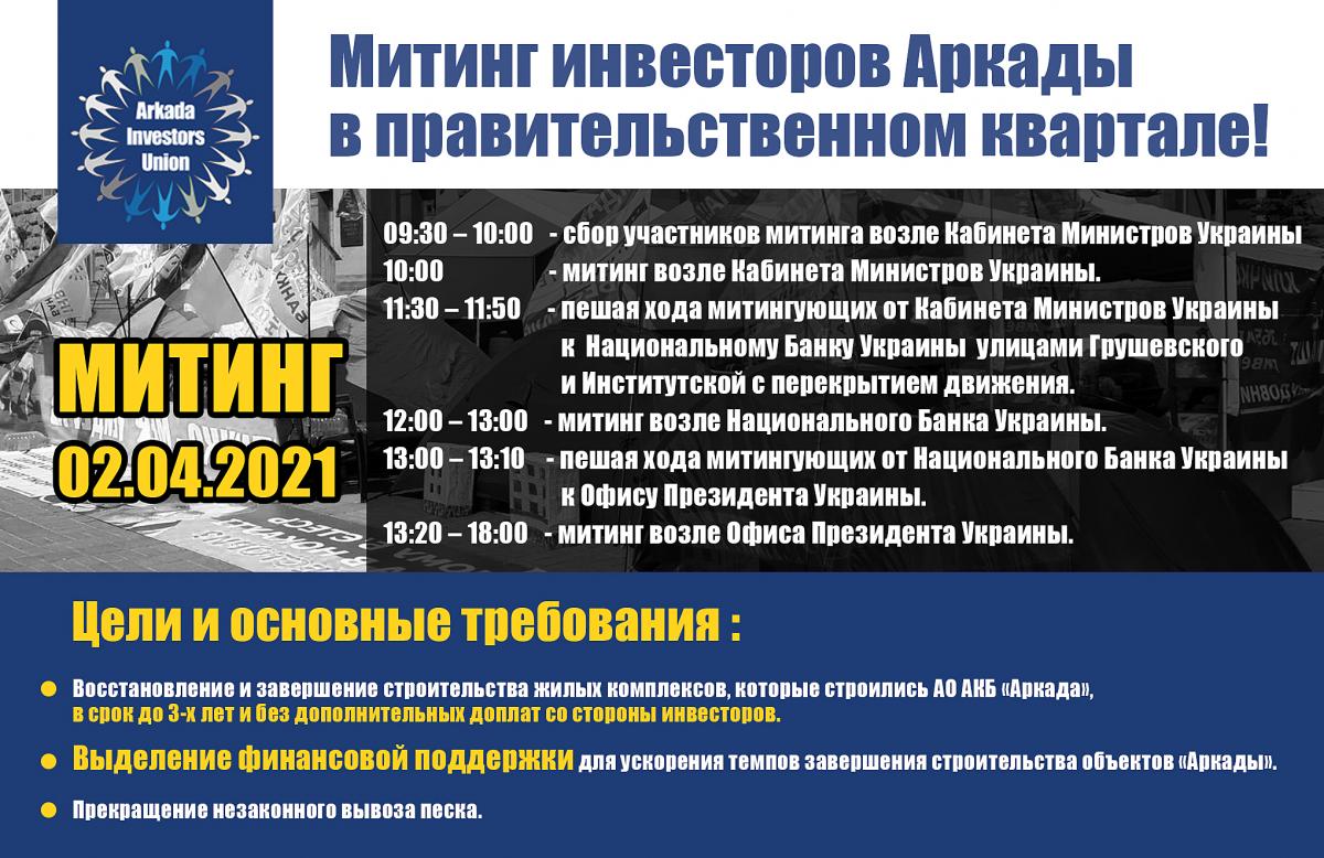 2 апреля инвесторы банка "Аркада" в очередной раз проведут мега-митинг в правительственном квартале (под Кабинетом Министров Украины, Национальным Банком Украины и Офисом Президента Украины) с перекрытием движения.