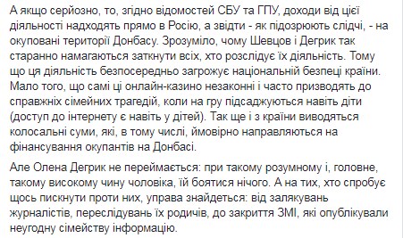 "Понятно, почему Шевцов и Дегрик так старательно пытаются заткнуть всех, кто расследует их деятельность. Эти онлайн-казино незаконные и часто приводят к настоящим семейным трагедиям, когда на игру подсаживаются даже дети. Так еще и из страны выводятся колоссальные суммы ", - подытожил Аронець.