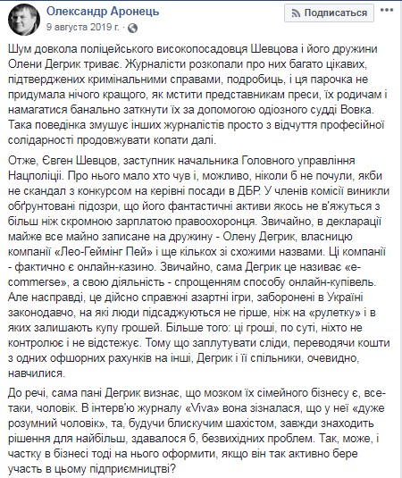 "Конечно, в декларации почти все имущество записано на жену - Елену Дегрик, владелицу компании" Лео-Гейминг Пей "и еще нескольких с похожими названиями. Эти компании - фактически онлайн-казино. Конечно, сама Дегрик это называет" e-commerse " , а свою деятельность - упрощением способа онлайн-покупок. Но на самом деле, это действительно настоящие азартные игры, запрещенные в Украине законодательно, на которые люди подсаживаются не хуже, чем на "рулетку" и в которых оставляют кучу денег. Более того, эти деньги, по сути, никто не контролирует и не отслеживает. Потому что запутывать следы, переводя их из одних офшорных счетов на другие, Дегрик и ее сообщники, очевидно, научились", - пишет Аронець.