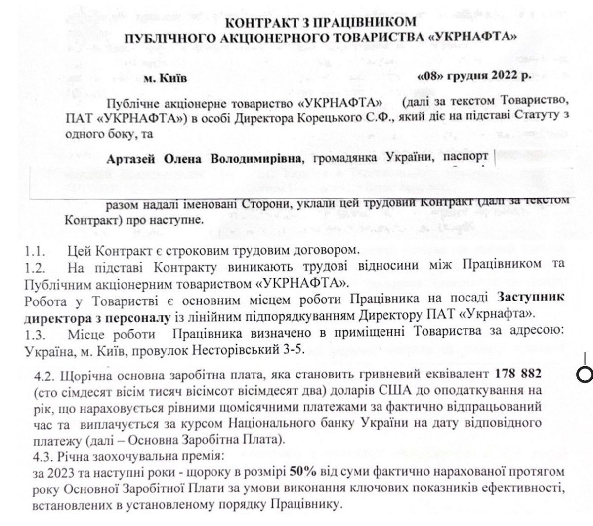Так, Корецкий заключил контракт с Еленой Артазей, которая, по сути, занимает должность "главного кадровика" ПАО и назначил ей заработную плату в размере более $22000 в месяц (ежемесячная зарплата и премия) - около 800 000 грн/месяц. Автор указал также, что согласно статье 21 Кодекса законов Украины о труде и нормам ЗУ "Об акционерных обществах", назначение Артазей является де-юре незаконным. Речь идет о том, что контракт может быть заключен только с членами исполнительного органа, членом наблюдательного совета и корпоративным секретарем. Если же заключение другого контракта законом не предусматривается, то собственник или уполномоченный им орган не имеет права заключать с работником такой трудовой договор, даже если имеется обоюдное согласие.