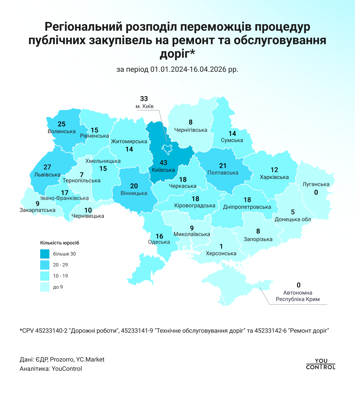 Местом регистрации наибольшего количества компаний по выборке стали Киев (33) и Киевщина (43). Также значительное количество юрлиц по выполнению ремонтных дорожных работ зафиксировано во Львовской (27), Волынской (25), Полтавской (21) и Винницкой (20) областях.