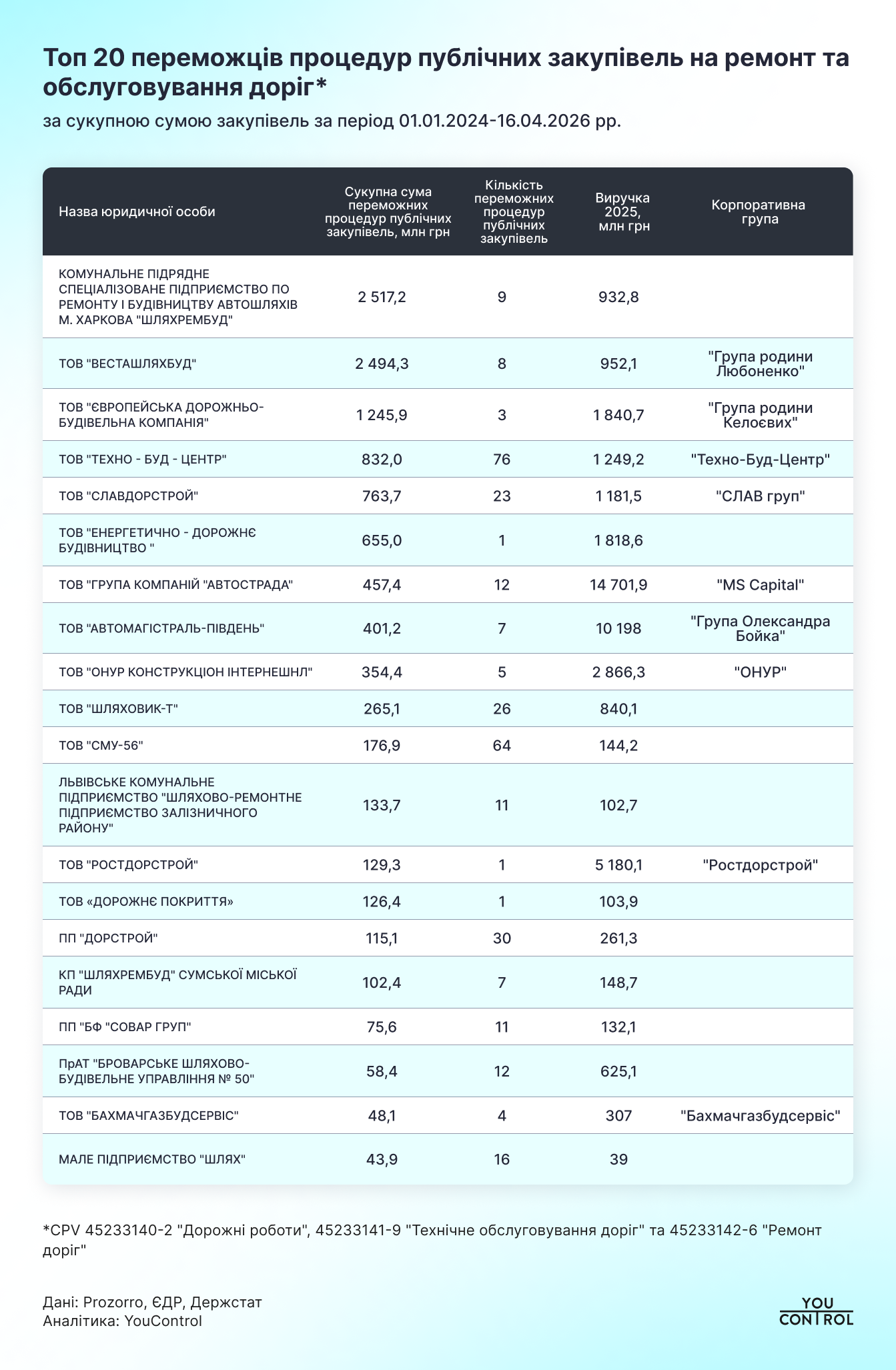 Около 85% (11 млрд грн) всех проанализированных закупок за период с 01.01.2024 года по 16.04.2026 приходится на 20 компаний-победителей. Наибольшие суммы госзаказов по проанализированным CPV, по 2,5 млрд грн каждая, получили Коммунальное подрядное специализированное предприятие по ремонту и строительству автодорог г. Харькова “Дорремстрой” и ООО “Весташляхстрой”.
