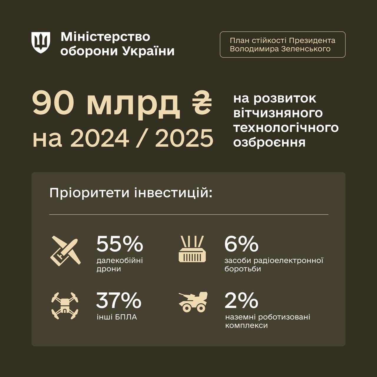 В ведомстве заявляют, что контрактация дронов-дипзабастовок, других БпЛА, средств РЭБ и роботизированных комплексов на 2024-2025 годы превысила 90 млрд грн. Сейчас она составляет почти треть всех расходов на вооружение.