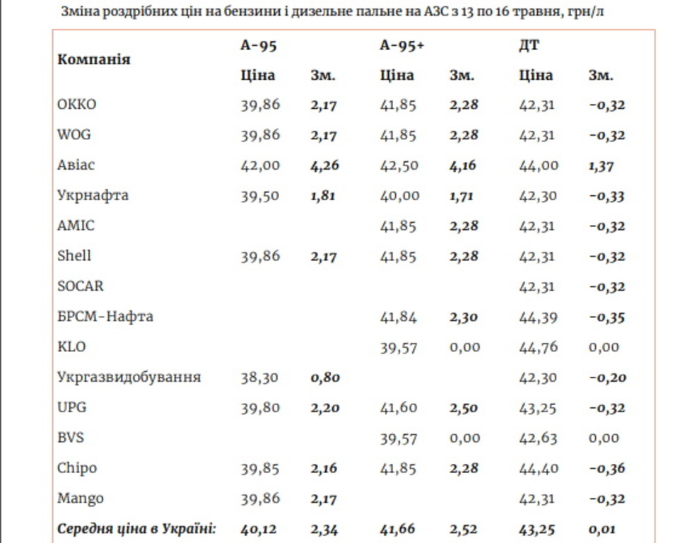 В Украине розничные сети автозаправочных станций в период с 13 по 16 мая откорректировали цены на бензин и дизельное топливо.