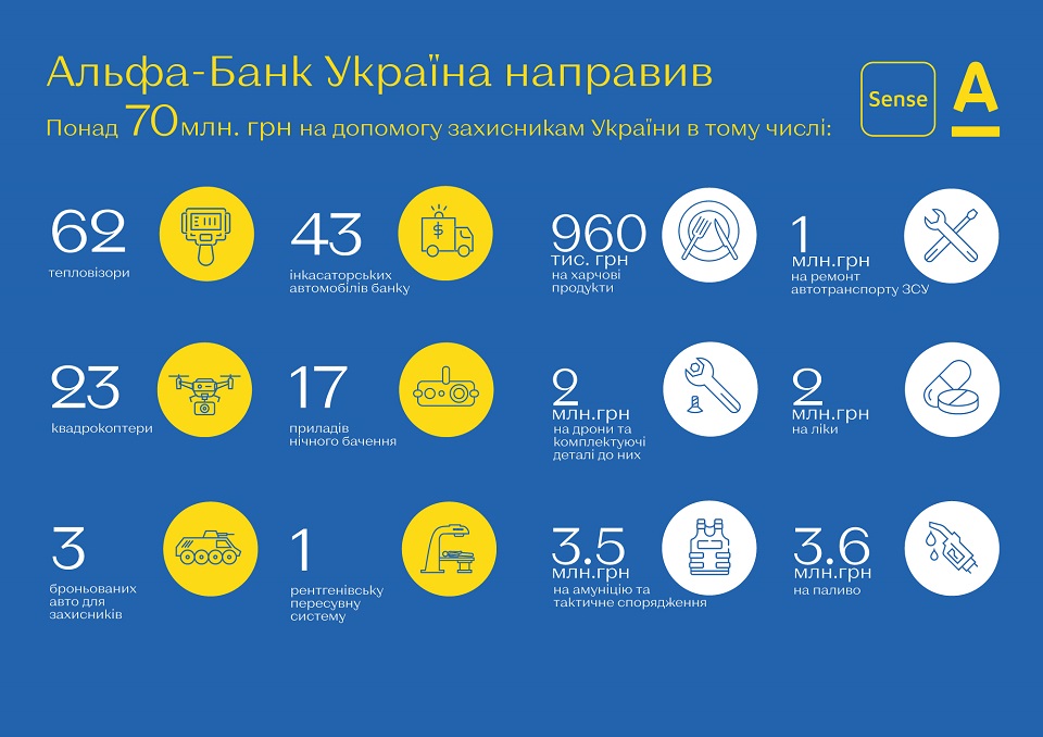 С 24 февраля Альфа-Банк из собственного бюджета выделил более 70 млн грн в помощь ВСУ и ТРО. В первые дни военных действий было осуществлено целевое финансирование армии на 10 млн грн и выделено 15 млн грн на транспортные услуги для ВСУ. Дополнительно на средства банка было приобретено: