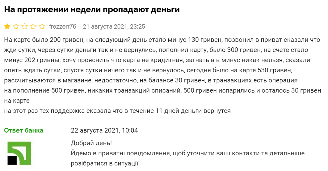 "На карте было 200 гривен, на следующий день стало минус 130 гривен. Позвонил в ПриватБанк. Сказали:" Жди сутки ". Через сутки деньги так и не вернулись... Расплачиваюсь в магазине: недостаточно - на балансе 30 гривен. В транзакциях есть операция на пополнение 500 гривен и никаких списаний. 500 гривен испарились и осталось 30 гривен на карте", - говорится в сообщении.