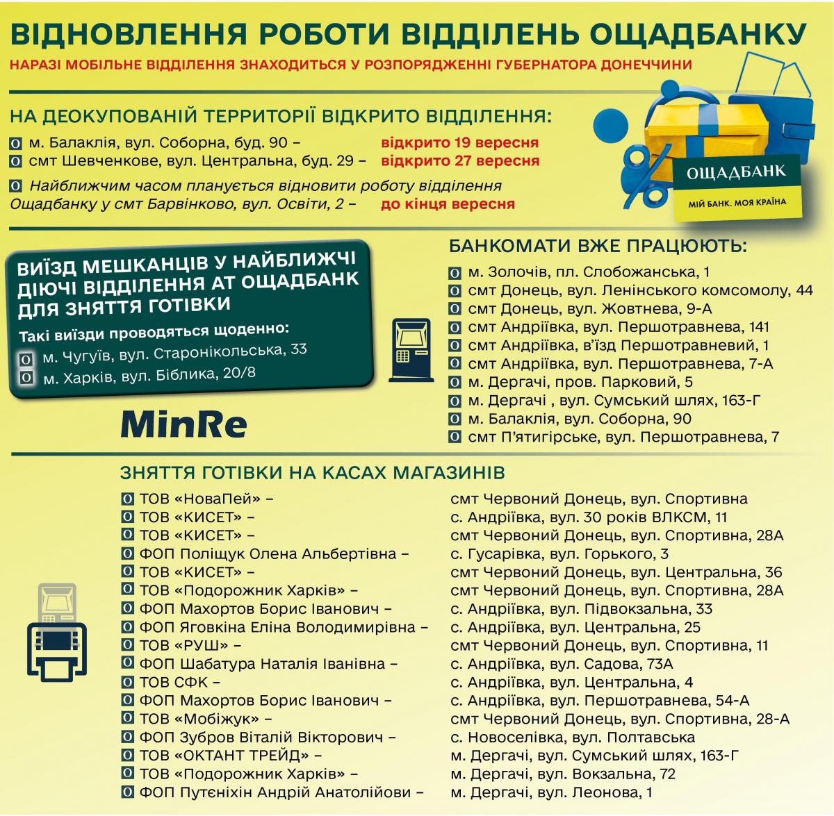 Также в Харьковской области восстанавливает работу и Ощадбанк. Недавно в пгт Шевченково открылось отделение банка: оно находится по улице Центральной, 29.
