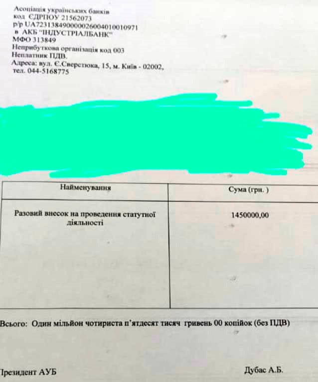 Как стало известно редакции, на днях некоторые украинские банки получили платежки от Ассоциации украинских банков (АУБ) на 1,45 млн грн с пометкой в графе "наименование" платежа - "разовый взнос на проведение уставной деятельности".