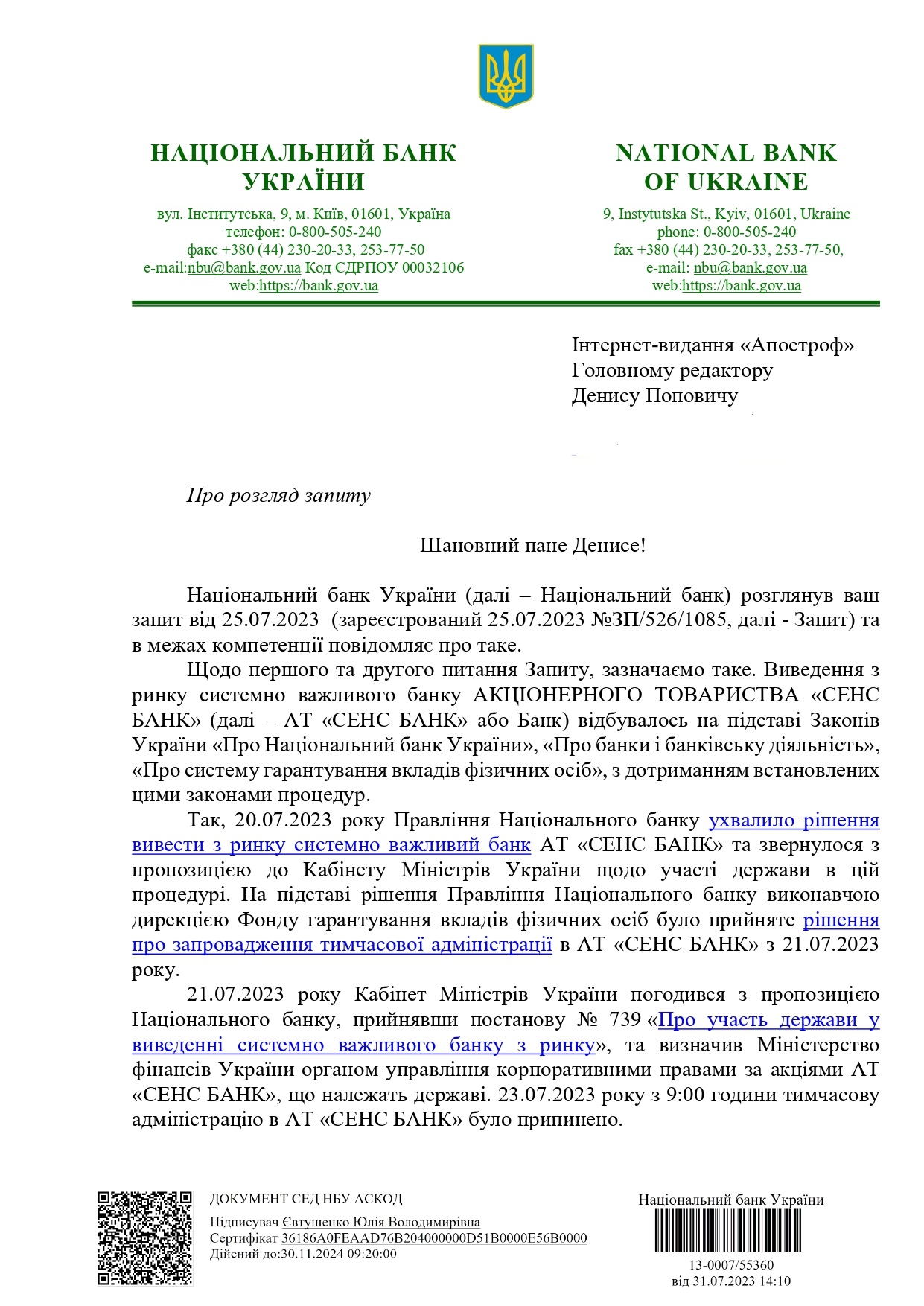 Национализация "Сенс Банка", которая состоялась 22 июля 2023 года, не навредит интересам клиентов финучреждения. Об этом говорится в ответе Национального банка Украины (НБУ) на официальный запрос "Апострофа".