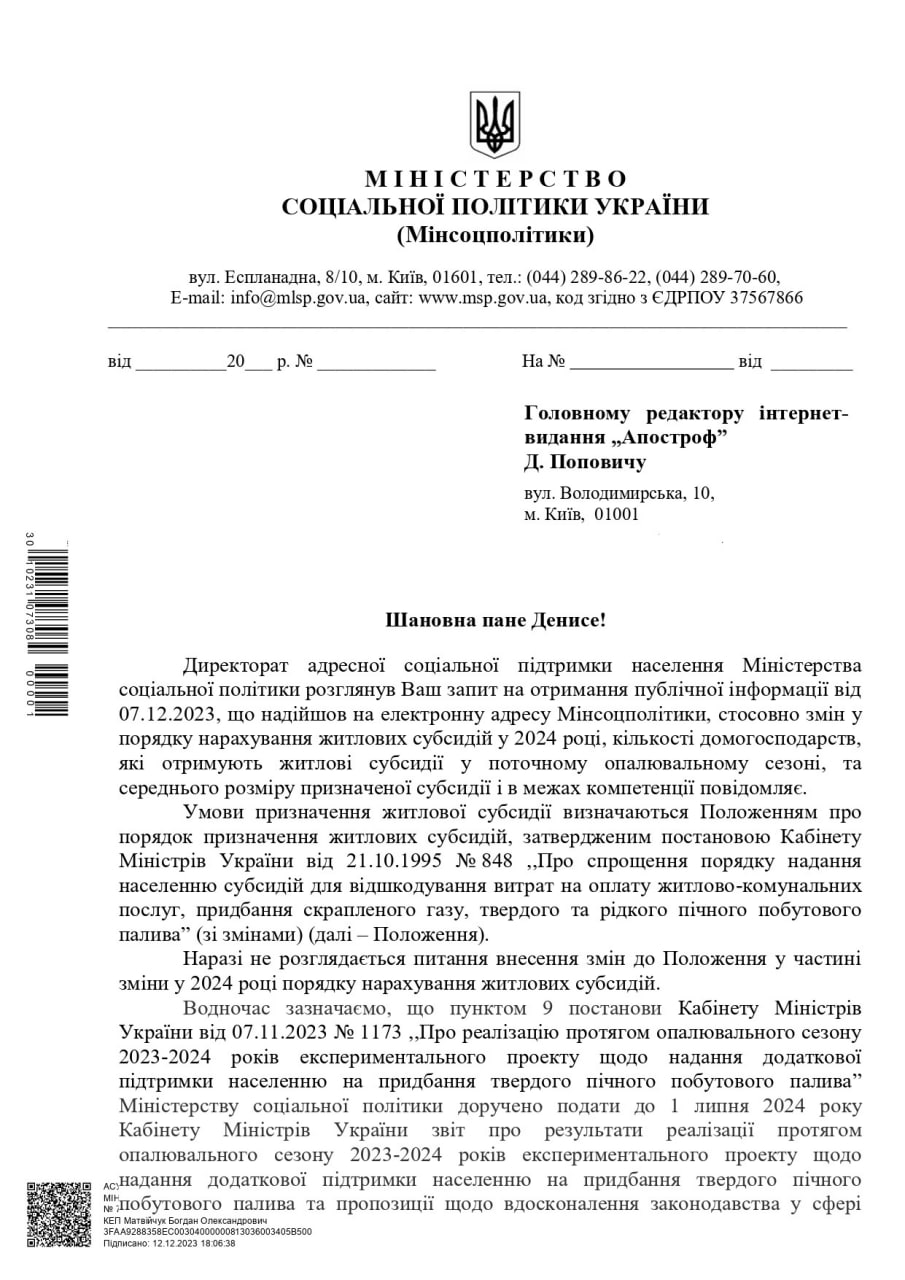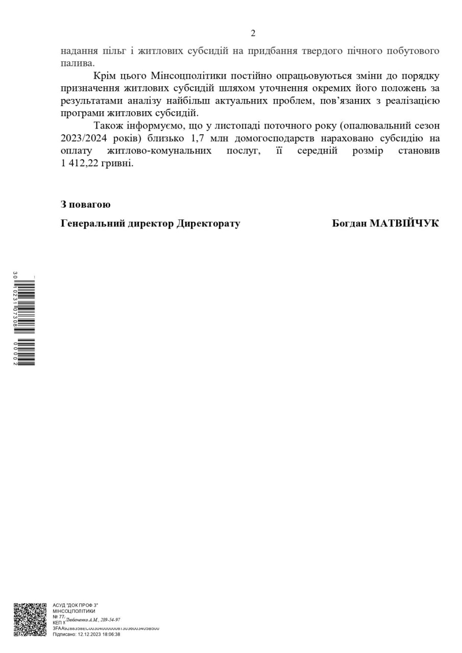 Как говорится в официальном письме Минсоцполитики, в ноябре текущего года (отопительный сезон 2023/2024 годов) около 1,7 млн домохозяйств начислена субсидия на оплату жилищно-коммунальных услуг. Средний размер субсидии составил 1412,22 гривны.