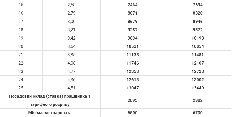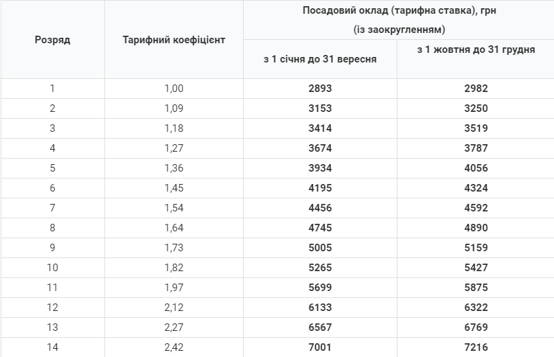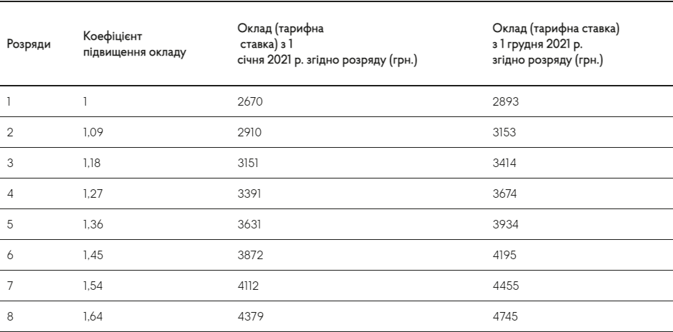 Кроме того, увеличивается размер оклада работников первого разряда Единой тарифной сетки (ЕТС). Если в январе-ноябре 2021 года он составлял 2 670 гривен, то с 1 декабря – 2 893 гривны.