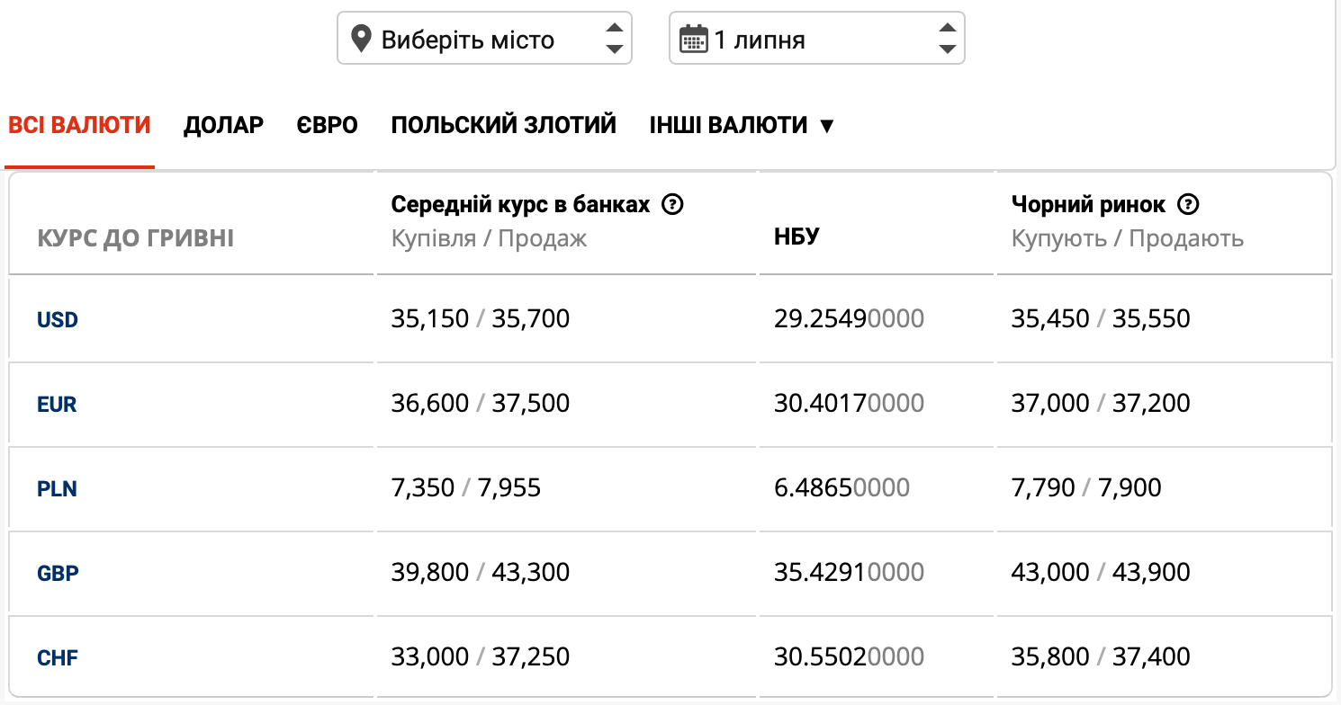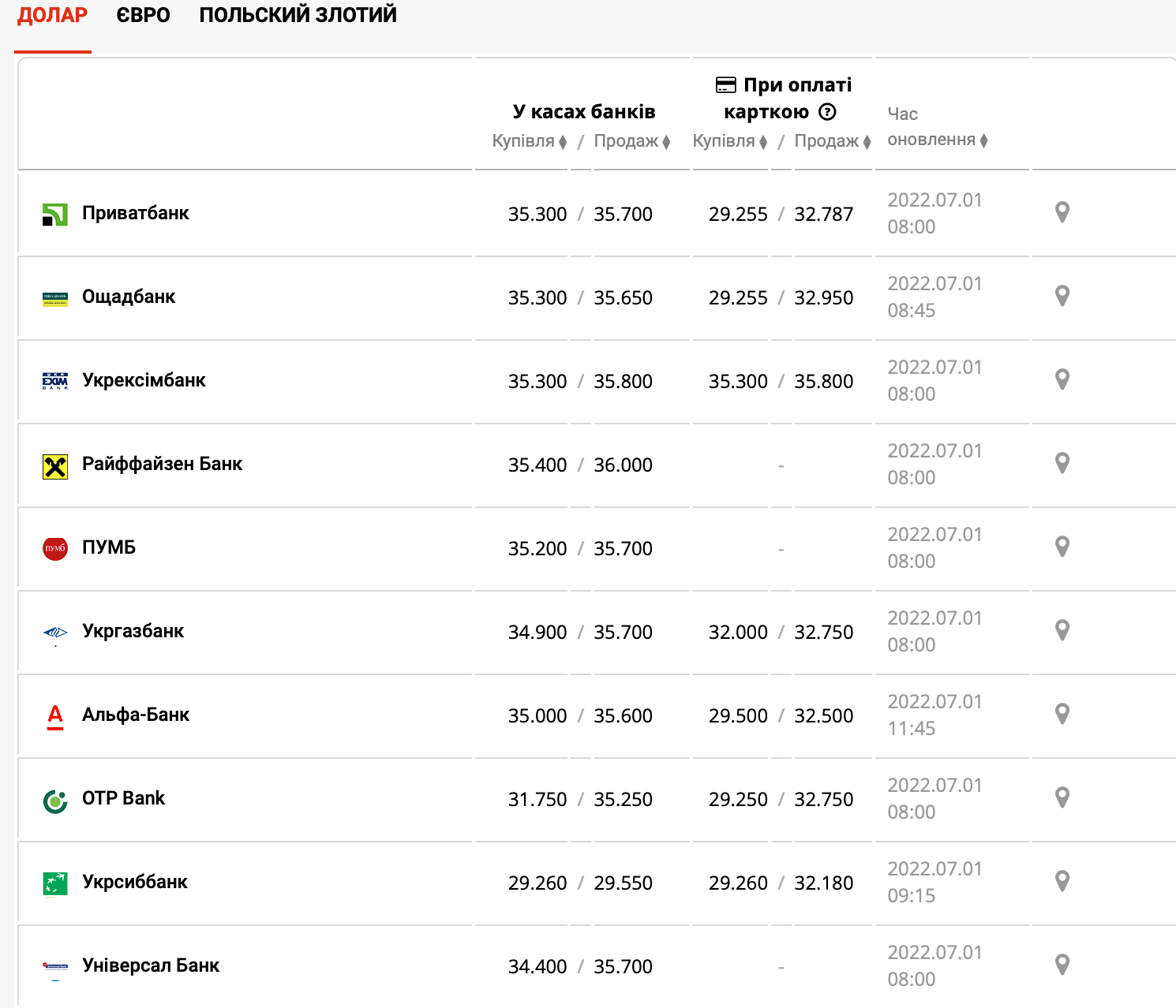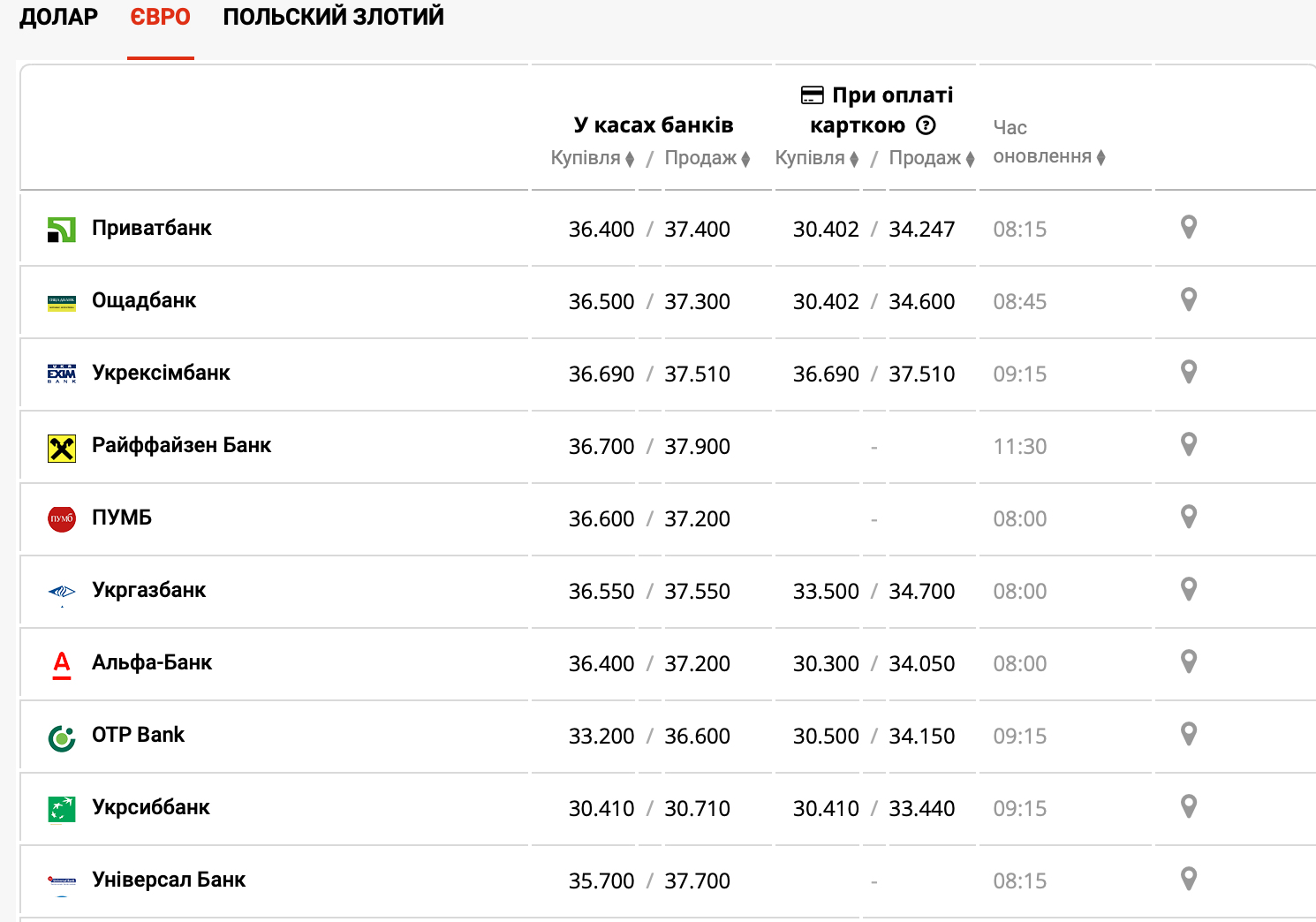 Курсы валют в украинских банках можно просмотреть в таблицах ниже: