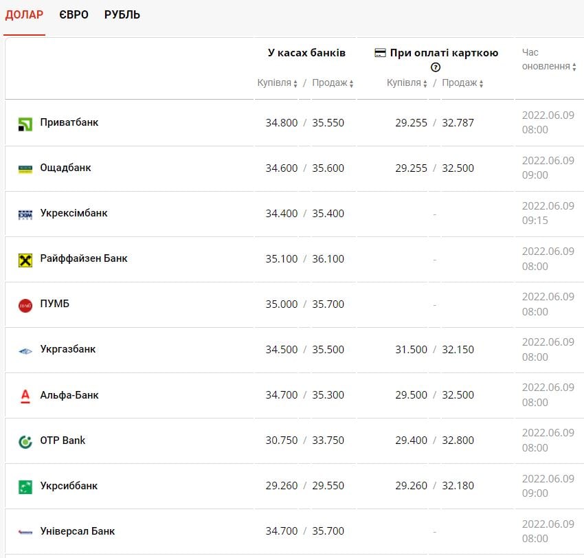 Средний курс доллара в украинских банках 9 июня составляет 34,70 при продаже и 35,50 при покупке.