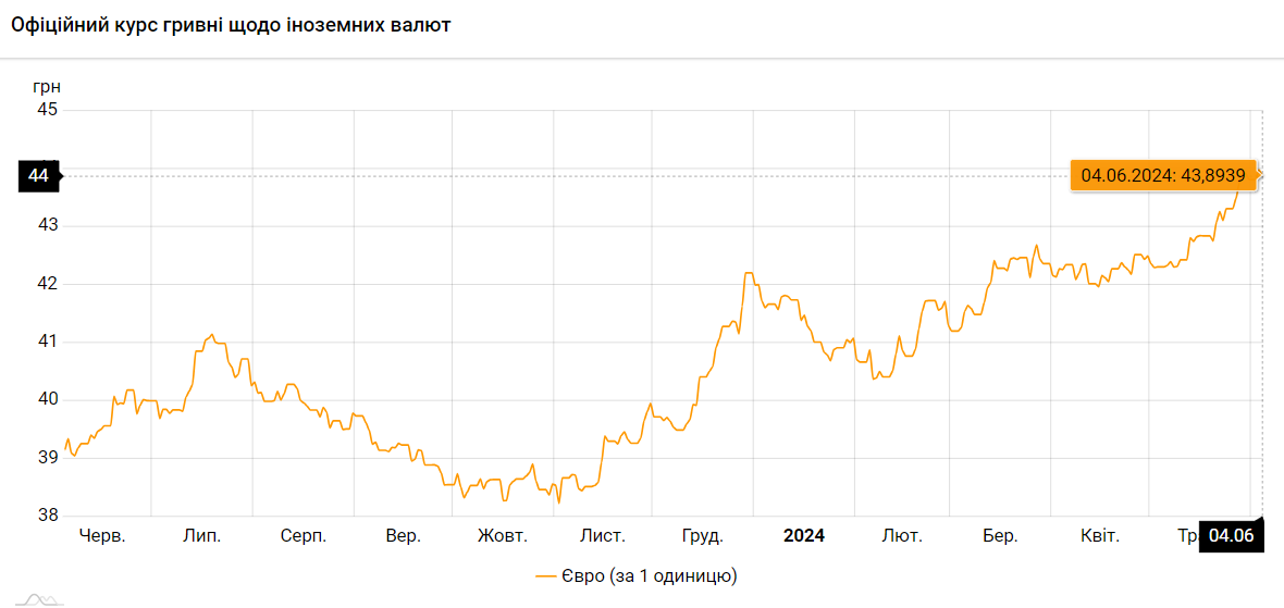Что касается европейской валюты - 4 июня зафиксировал курс на уровне 43,8939 грн за 1 евро. По сравнению с предыдущим банковским днем евро подешевело на 9 копеек. Минфин добавляет, что средний курс евровалюты в банках сегодня составит: