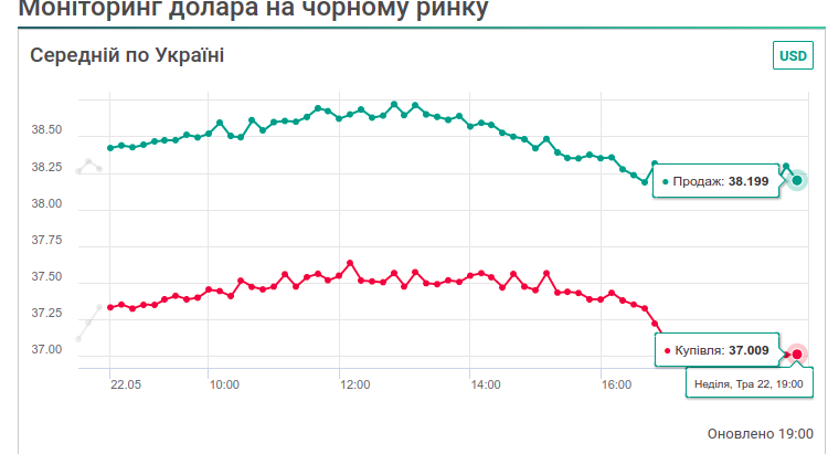 В воскресенье, 22 мая, курс доллара на черном рынке продолжил свой рост и перешагнул отметку в 38 гривен.