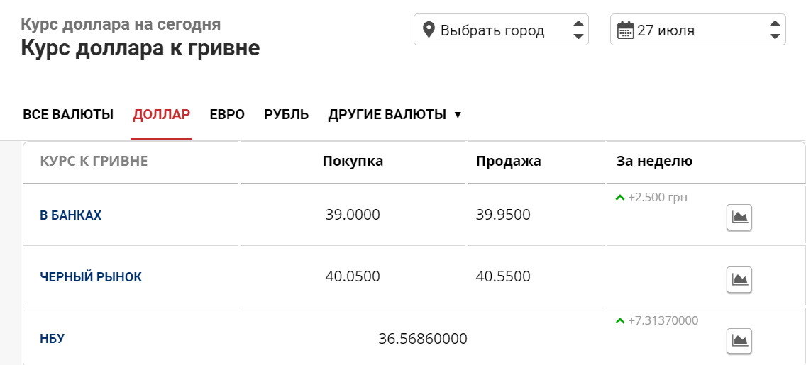 По состоянию на вечер 27 июля, средняя цена доллара в банках установилась на уровне 39 гривен при покупке и 39,95 гривен при продаже. Не черном рынке американская валюта торгуется на уровне 40,00 и 40,55 гривен, соответственно.