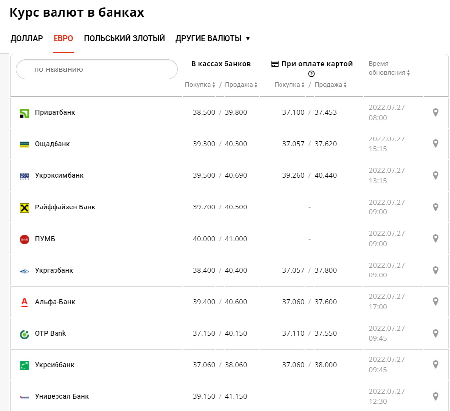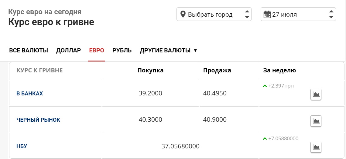 Также приведены таблицы стоимости доллара и евро в банках Украины по состоянию на 27 июля.