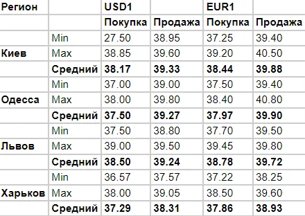 В украинских банках наличные курсы валют при покупке находятся в коридоре: 27,50 гривны (в Киеве) – 39 гривен (во Львове) за доллар. При продаже – от 37,57 гривны (в Харькове) до 39,80 гривны (в Одессе).