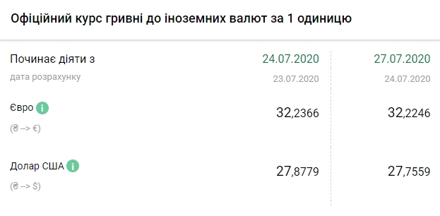 Курс валют от НБУ на 27 июля