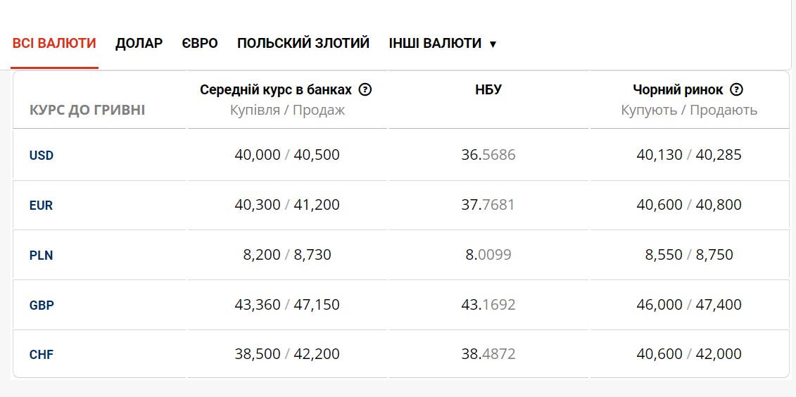 На данный момент доллар можно купить за 40,27 грн, а продать - за 40,13 грн. В обменниках его курс варьируется от 40,12 до 40,25 грн. На черном рынке доллар можно приобрести за 40,40 грн, а продать – за 40,20 грн. В банках курс составляет 40,00–40,50 грн за доллар.