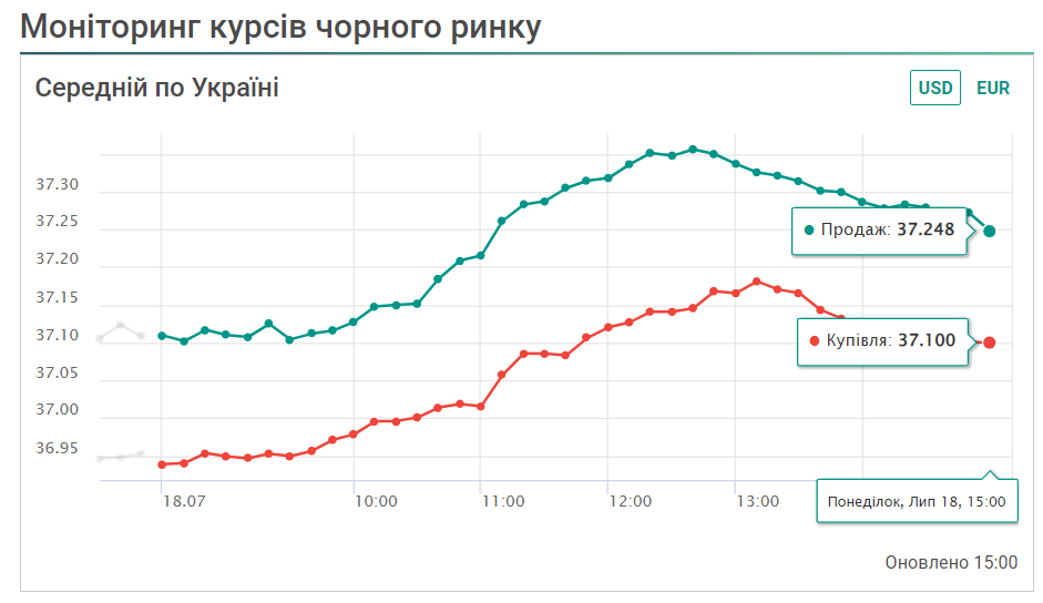 Так, состоянием на утро 18 июля, средний курс доллара на валютном аукционе по сравнению с пятницей, возрос на 13 копеек в продаже, до 37,35 грн/$, а в покупке – на 8 копеек, до 37,14 грн/$. После полудня американская валюта держит восходящий тренд в обменниках.