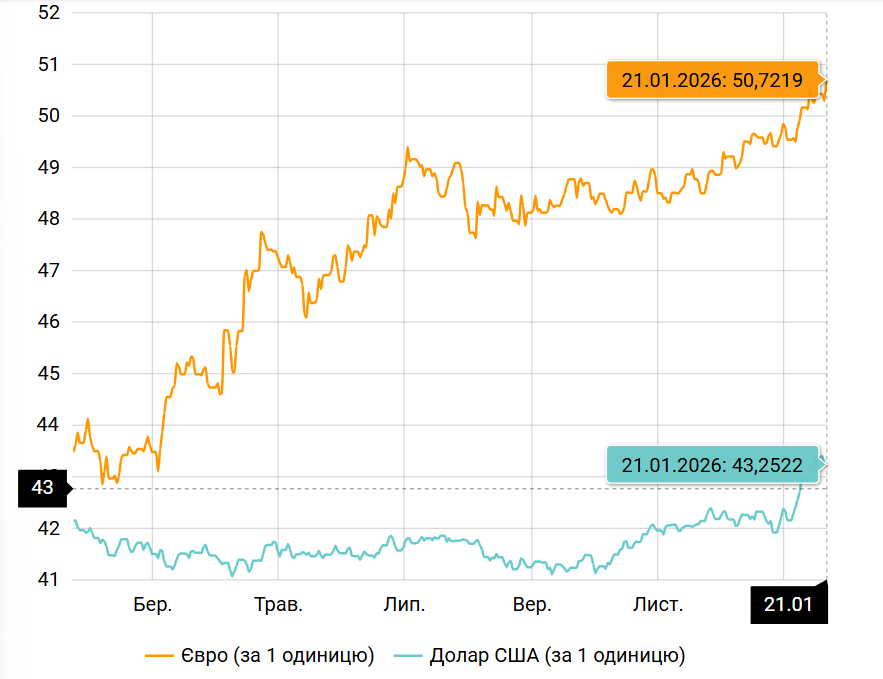 Национальный банк Украины установил на 21 января официальный курс евро на уровне 50,72 грн, что является самым высоким показателем за время наблюдений. По сравнению с предыдущим банковским днем европейская валюта подорожала на 42 копейки, тогда как курс американского доллара продемонстрировал незначительное снижение.