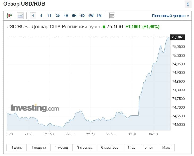 По состоянию на 8:00 утра 3 января по московскому времени (7:00 по Киеву), курс рубля по отношению к доллару составляет 75,10 руб/долл. Тогда как на закрытии торгов 2 января курс был на уровне 74 рубля за 1 доллар.