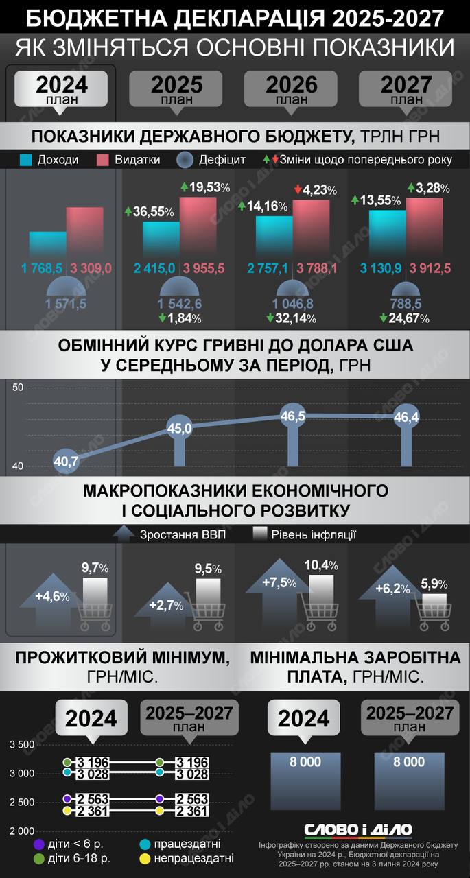 В 2024 году среднегодовой курс гривны по отношению к доллару заложен на уровне 40,7 гривен. По прогнозу Кабмина, в 2025 году курс будет 45 гривен, в 2026 – 46,5 гривен, в 2027 году – 46,4 гривен.