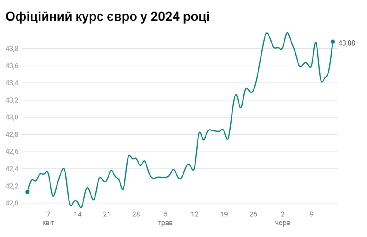 По состоянию на 15 июня, по информации Национального банка Украины, официальный курс евро составляет 43,88 грн, а доллар – 40,69 грн. При этом 13 июня официальный курс евро был 43,53. 14 июня курс был такой же, поднявшись на 35 копеек, по сравнению с 13 июня. Максимальный курс евро был зафиксирован 3 июня, когда стоимость составляла 43,98 грн.