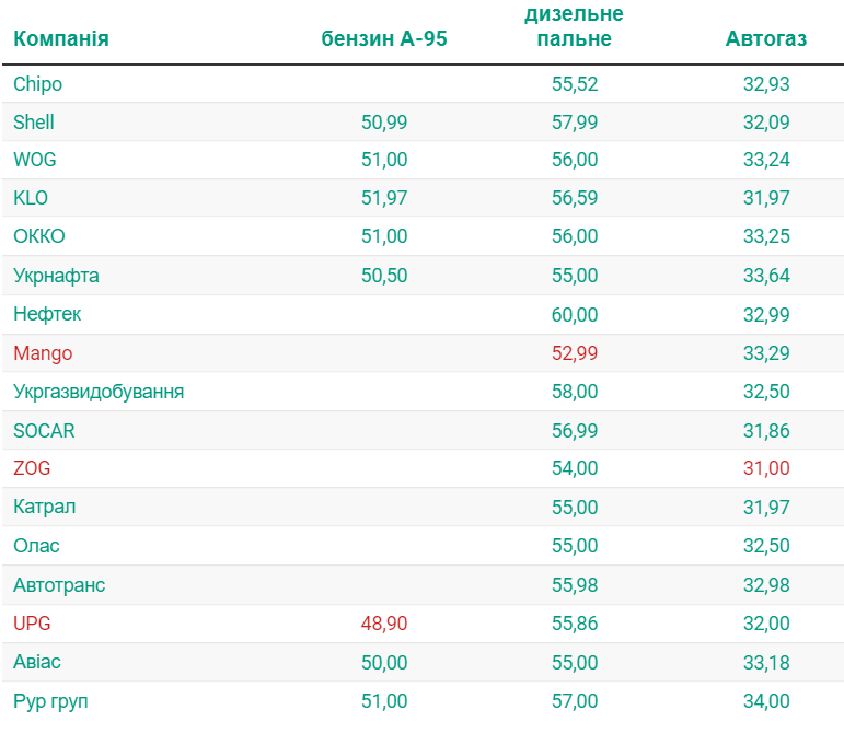 В сети "БРСМ-Нефть" литр ДТ стоит 54,59 гривны, за выходные оно потеряло в цене 2,25 гривны. От 0,35 до 1,5 гривны снизили цены "Автотранс", "Олас", Mango, Prime и другие операторы.