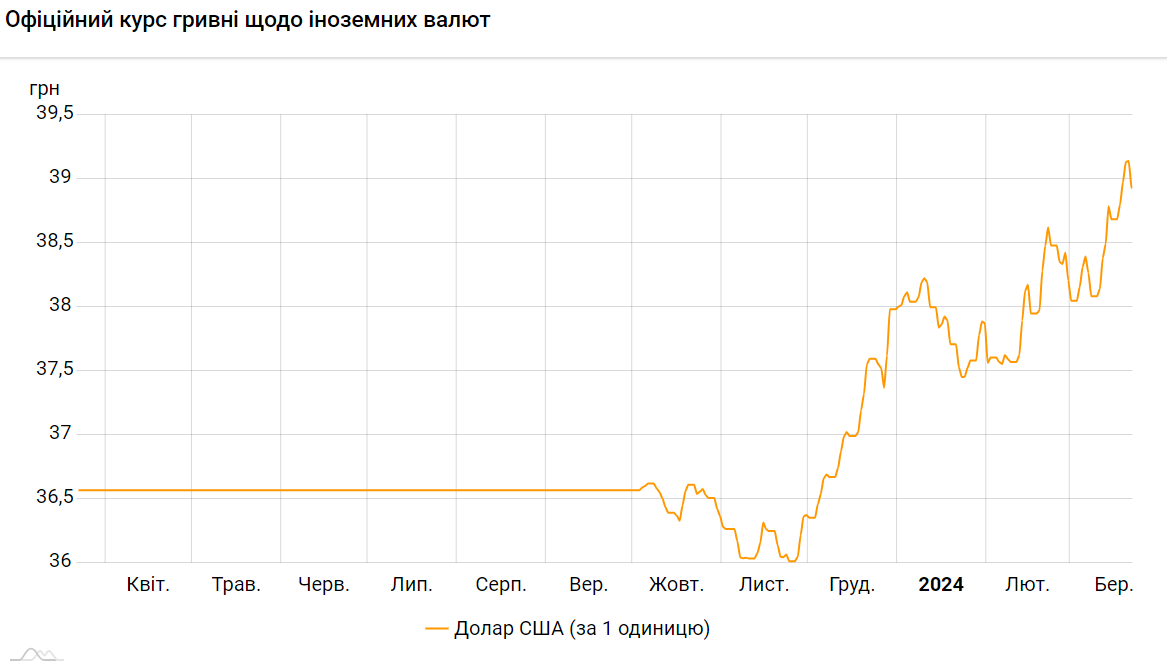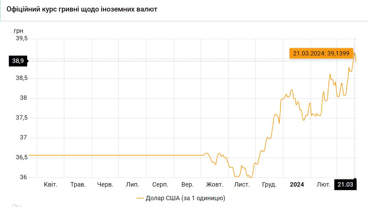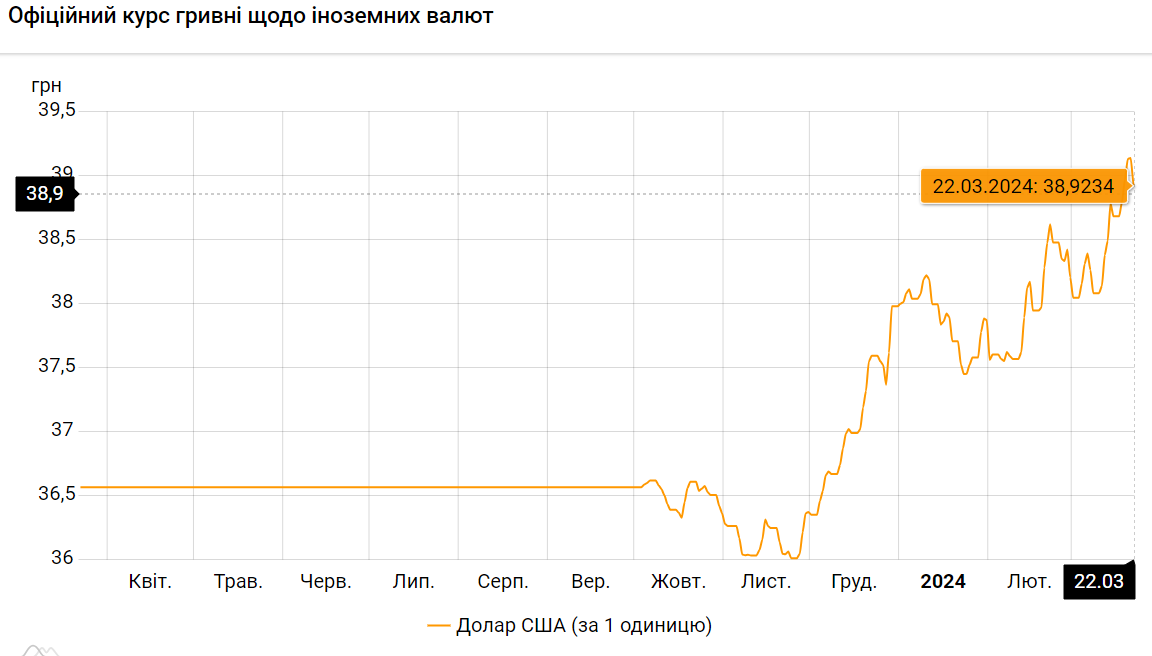 По состоянию на пятницу, 22 марта, Национальный банк Украины установил официальный курс гривны к доллару на уровне 38,9234 грн/$.