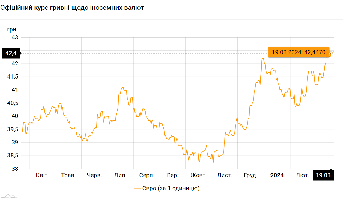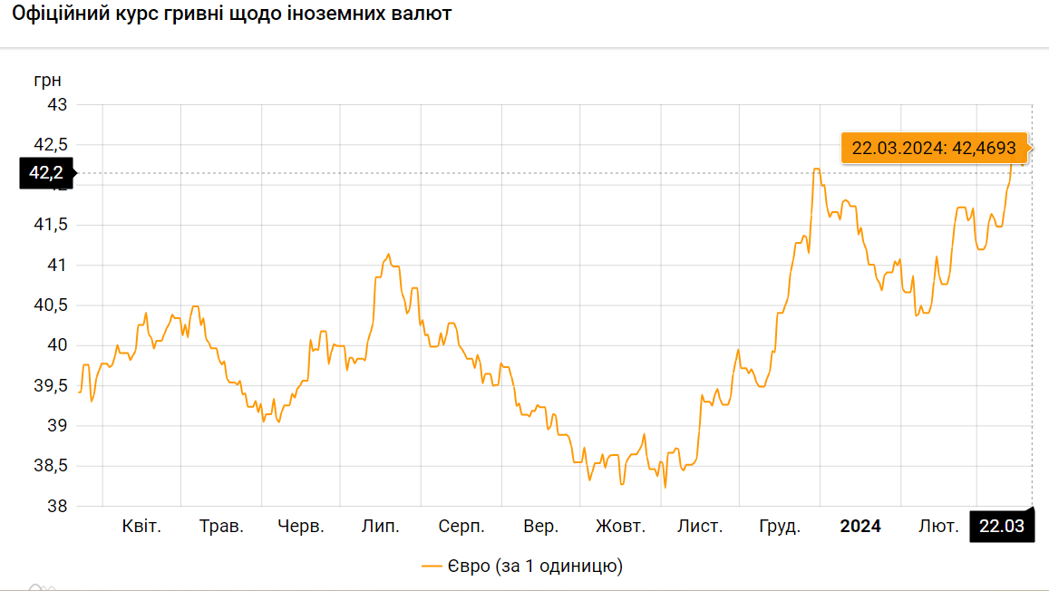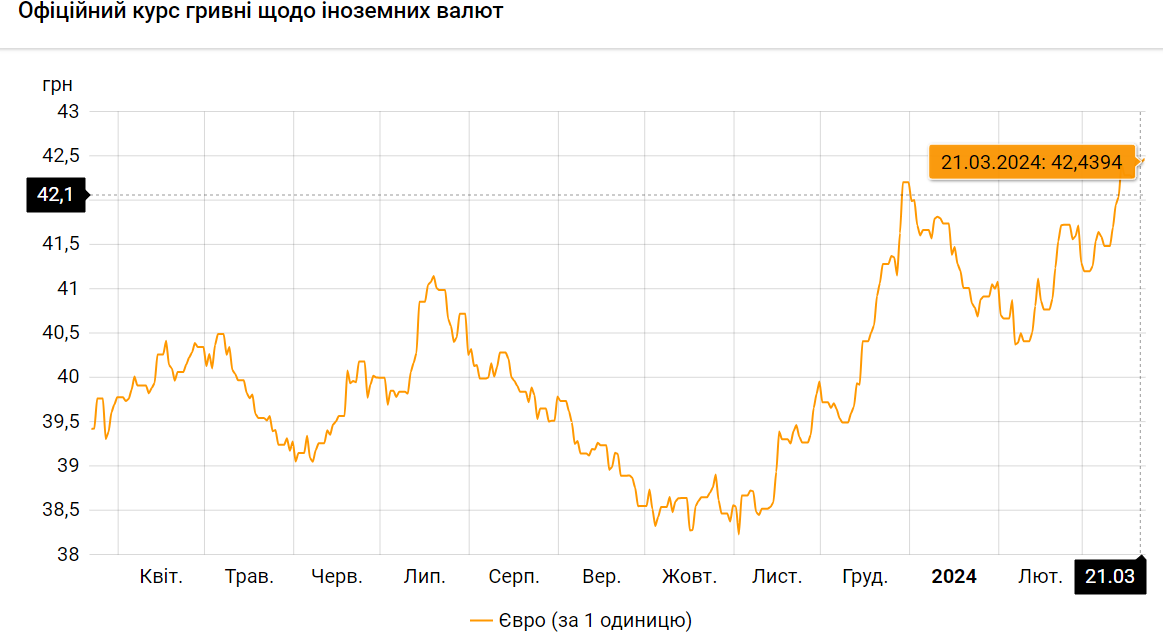 Если посмотреть еще и курс гривны к евро, то по состоянию на 22 марта 2024 года Нацбанк зафиксировал его на размере 42,4693 грн/€. За вчерашний банковский день официальный курс гривны по отношению к евро составил 42.4394 грн/€. Следовательно, сегодня показатели упали, чем установили новый исторический минимум, заменив прежний исторический минимум, который был установлен 19 марта – 42.4470 грн/€.