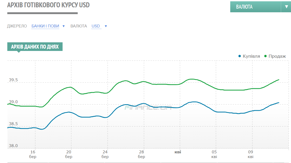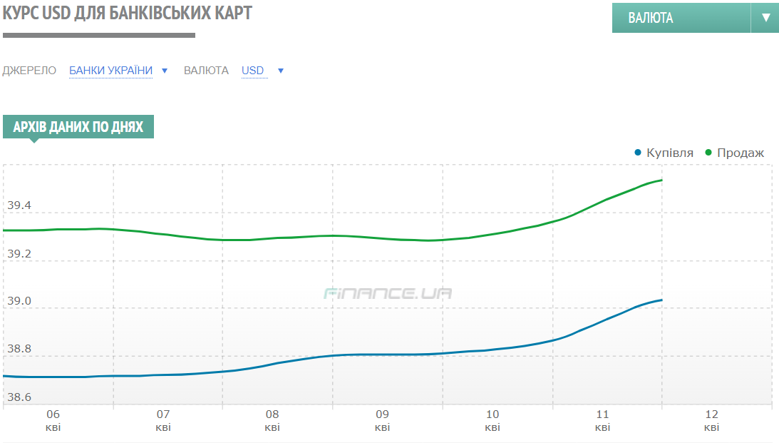 - Доллар США - 39,0 - 39,5 грн (курс на 11 апреля - 39,0 - 39,4 грн);