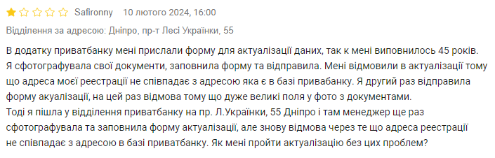 Одна из клиенток сообщила, что после того, как ей исполнилось 45 лет, ПриватБанк направил ей форму для актуализации данных, иначе счета будут заблокированы.