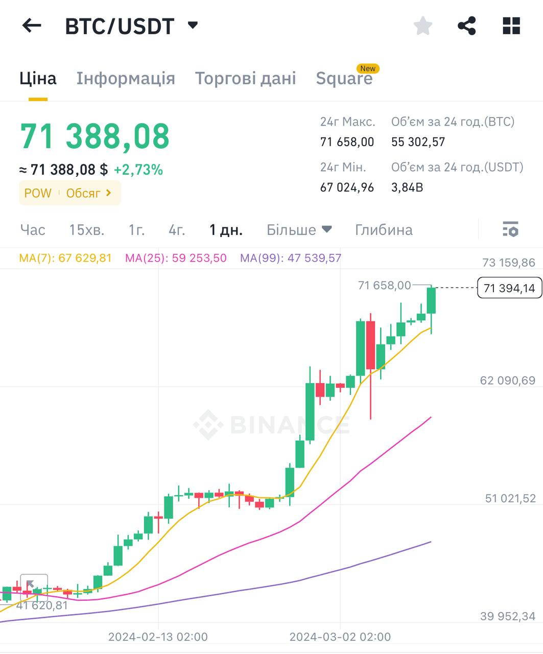 За последние сутки он подорожал более чем на 2%. На момент написания материала стоимость биоткоина составляла $71 388.