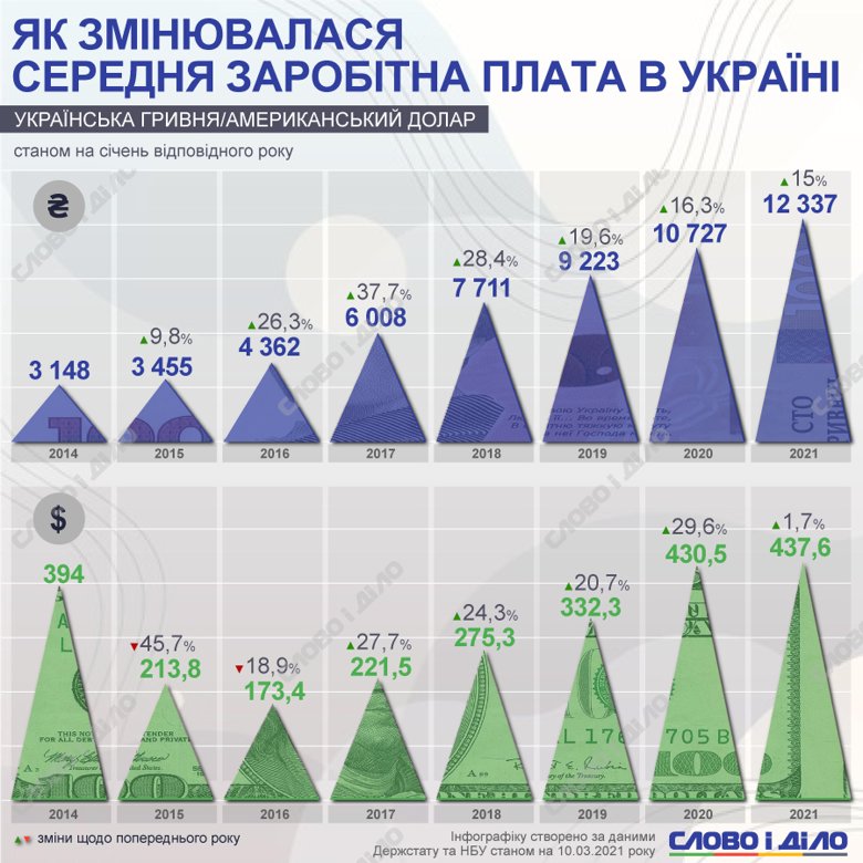 По данным Госстата, в начале прошлого года украинцы в среднем получали 10 тысяч 727 грн (430,5 долларов). В январе 2021 средняя зарплата составила 12 тысяч 337 грн (+15%), но из-за ослабления гривны в пересчете на доллары разница небольшая – 437,6 доллара.
