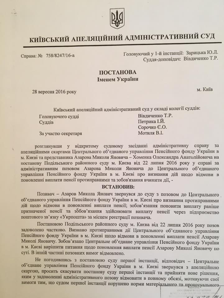 Своим постановлением от 28 сентября Апелляционный суд отменил постановление суда первой инстанции и принял новое решение, которым обязал Пенсионный фонд рассмотреть заявление представителя Николая Азарова по вопросу возобновления выплаты пенсии украинскому экс-премьеру.