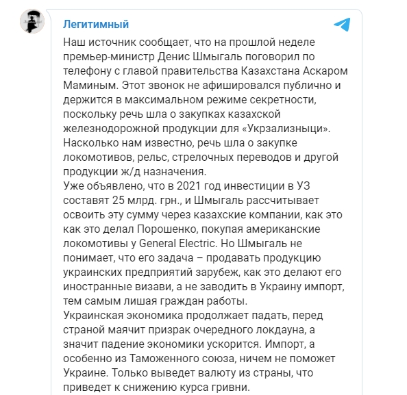 "Насколько нам известно, речь шла о закупке локомотивов, рельс, стрелочных переводов и другой продукции ж/д назначения, - говорится в сообщении. - Уже объявлено, что в 2021 год инвестиции в УЗ составят 25 млрд грн, и Шмыгаль рассчитывает освоить эту сумму через казахские компании".