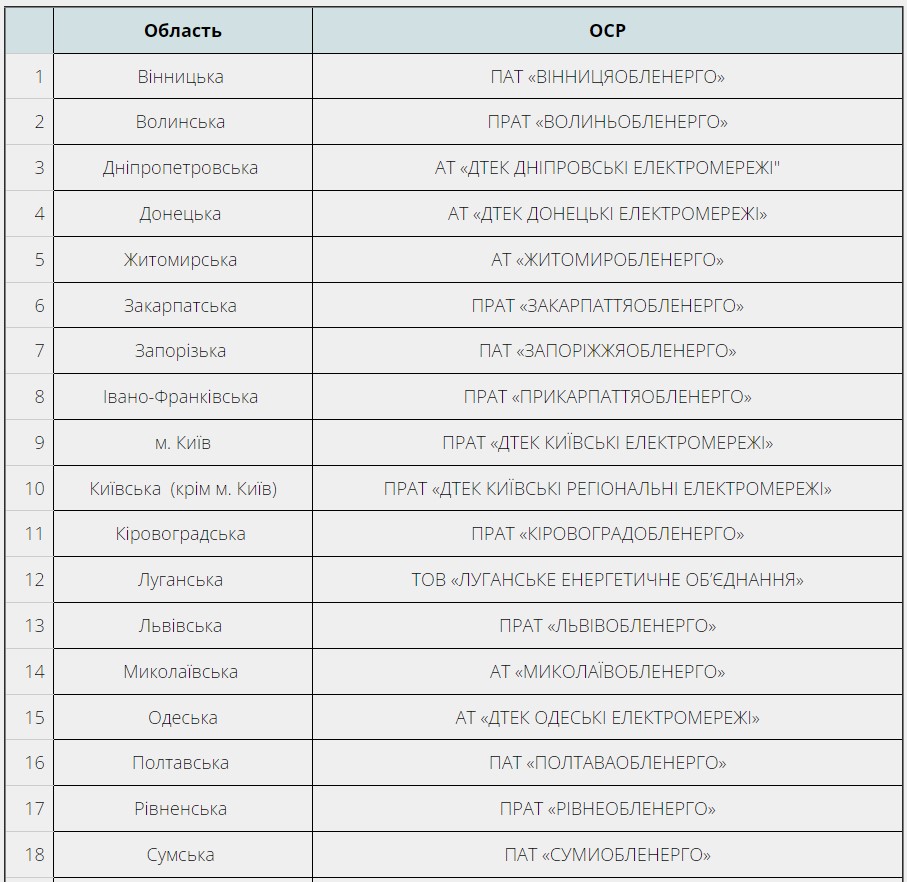 Поскольку операторы системы распределения (ОСР) закреплены за каждым регионом, необходимо узнать, кто обслуживает область и как называется ОСР.