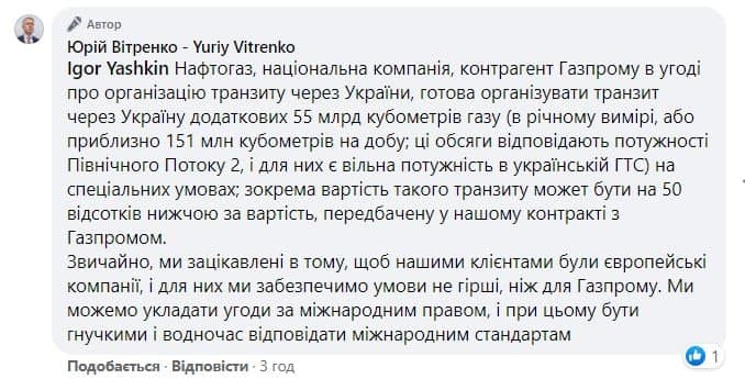 Об этом написал глава правления "Нафтогаза" Юрий Витренко на своей странице в Facebook, отвечая на вопрос одного из комментаторов.