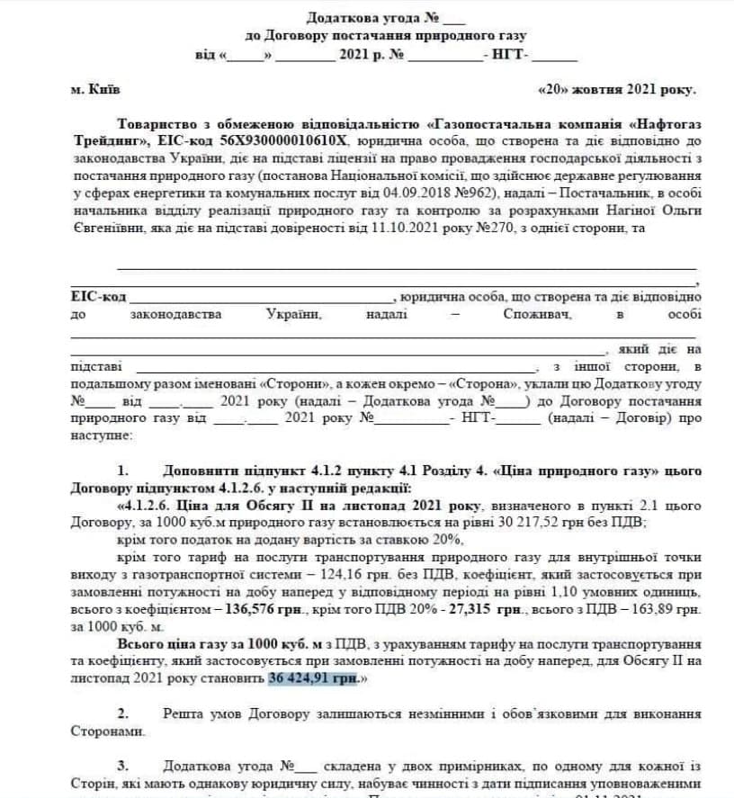 В Киеве объединения совладельцев многоквартирных домов получили от газопоставляющей компании "Нафтогаз трейдинг" дополнительные соглашения на поставку газа на ноябрь 2021. Согласно документу, цена "голубого" топлива вырастет до 36 424,91 грн за 1 тысячу кубометров газа.