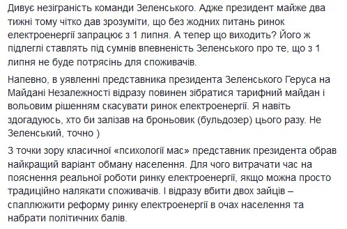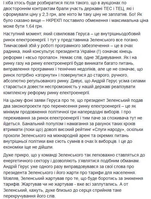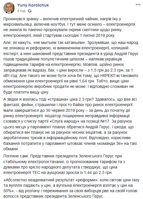 "Поняв, что наш народ не испугаешь ни реформой, ни отключением электроэнергии, бывший эксперт, а ныне уважаемый представитель президента в правительстве Андрей Герус пошел традиционным популистским путем - напугал украинцев повышением тарифов на электроэнергию. Мол, как только рынок заработал как сразу, бах, и цены выросли - с 1,5 грн до 2,3 грн за 1 кВт-ч. Но такого не может быть хотя бы потому, что НКРЭКУ установило ограничения цены электроэнергии на уровне 1,64 грн. То есть, выше цен на электроэнергию производитель продать не может. И соответственно потребитель не будет платить более высокую цену", - отметил он.
