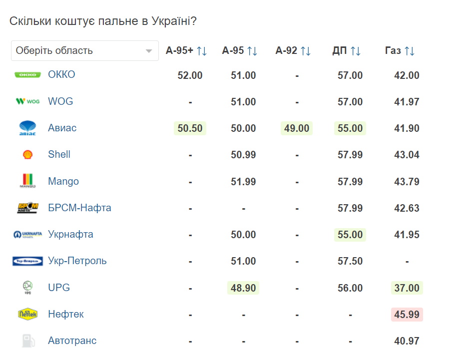 В таблице представлены усредненные цены заправок по всей Украине и могут отличаться в городах, в зависимости от региона страны.