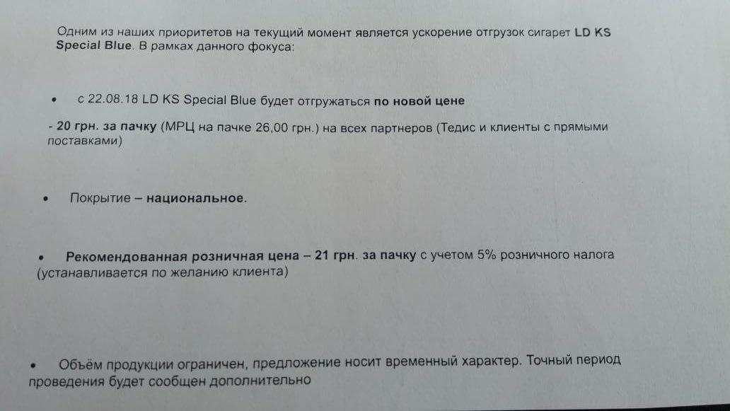 Клиенты табачного дистрибутора-монополиста TEDISUkraine получили письмо от компании JTI Украина (один из международных производителей сигарет, работающих на рынке Украины) о том, что с 22 августа сигареты ТМ "LD KS Special Blue" будут отгружаться по новой цене – 20 грн. за пачку.
