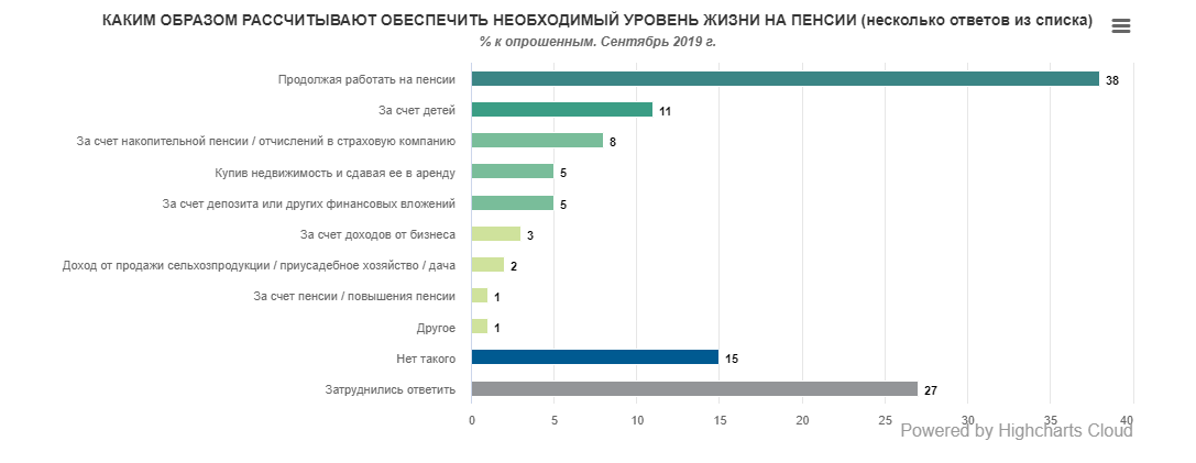 38% считает, что выжить на пенсию можно только в том случае, если продолжать работать. 11% рассчитывает на помощь детей после ухода на пенсию, 8% дополнительным источником дохода назвали накопительную пенсию. 5% предложили зарабатывать на депозитах, а еще 5% - на доходах от собственного бизнеса.